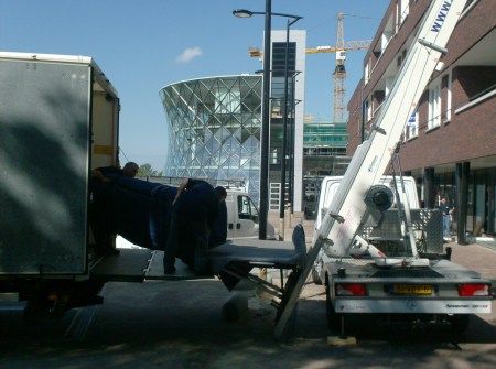 Voor meerdere stukken die verhuisd dienen te worden. Inclusief twee man personeel waarvan één liftbedienaar. Mogelijk tot 32 meter (10 hoog). Hefvermogen 300 kilo. Minimale afname van 4 uur.